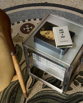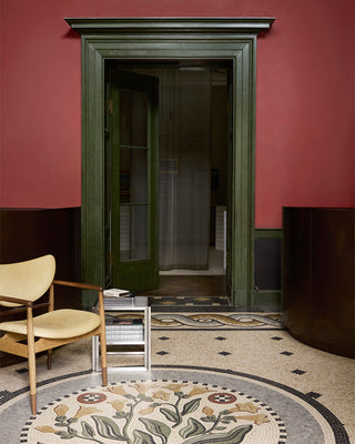 Das Interiordesign ist von der stillen Eleganz der Interieurmalereien von Vilhelm Hammershøi inspiriert. Eine durchdachte Kombination aus Regalen aus gebürstetem Stahl und warmen Holzelementen schafft ein Gleichgewicht zwischen Struktur und Weichheit. Das Japanese Cabinet und das Foldable Floor Shelf von Kristina Dam Studio bilden ein funktionales und harmonisches Gerüst, in dem Stahl und Holz in ausgewogener Weise zusammentreffen und jedem Produkt Raum geben, während Besucher zum Entdecken und Verweilen eingeladen werden.