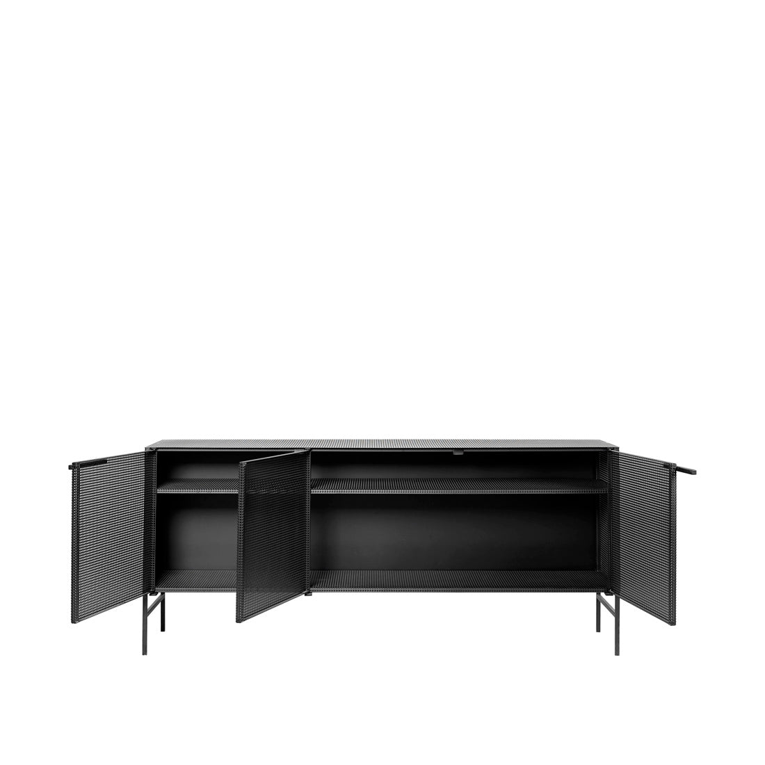 Die Grid Anrichte hat eine minimalistische, aber dennoch beeindruckende Ausstrahlung. Sie besteht aus wunderschönem, schwarz perforiertem, pulverbeschichtetem Stahl, der einen spannenden und zugleich leichten visuellen Ausdruck schafft. Bewahren Sie Bücher, Skulpturen oder Geschirr in ihr auf. Die transparente Wirkung lässt die Anrichte leicht erscheinen und erlaubt gleichzeitig einen dezenten Blick auf die Objekte im Inneren. Ein elegantes Designerstück mit typisch dänischem Ansatz – klare grafische Linien, ein schnörkelloses Design. Große Anrichten wie die Grid Anrichte sind seit Generationen beliebt, weil sie nahezu alles aufbewahren und präsentieren können. Ein zeitloses Möbelstück. Vervollständigen Sie Ihr Zuhause mit einem Produkt aus unserer Grid-Serie.